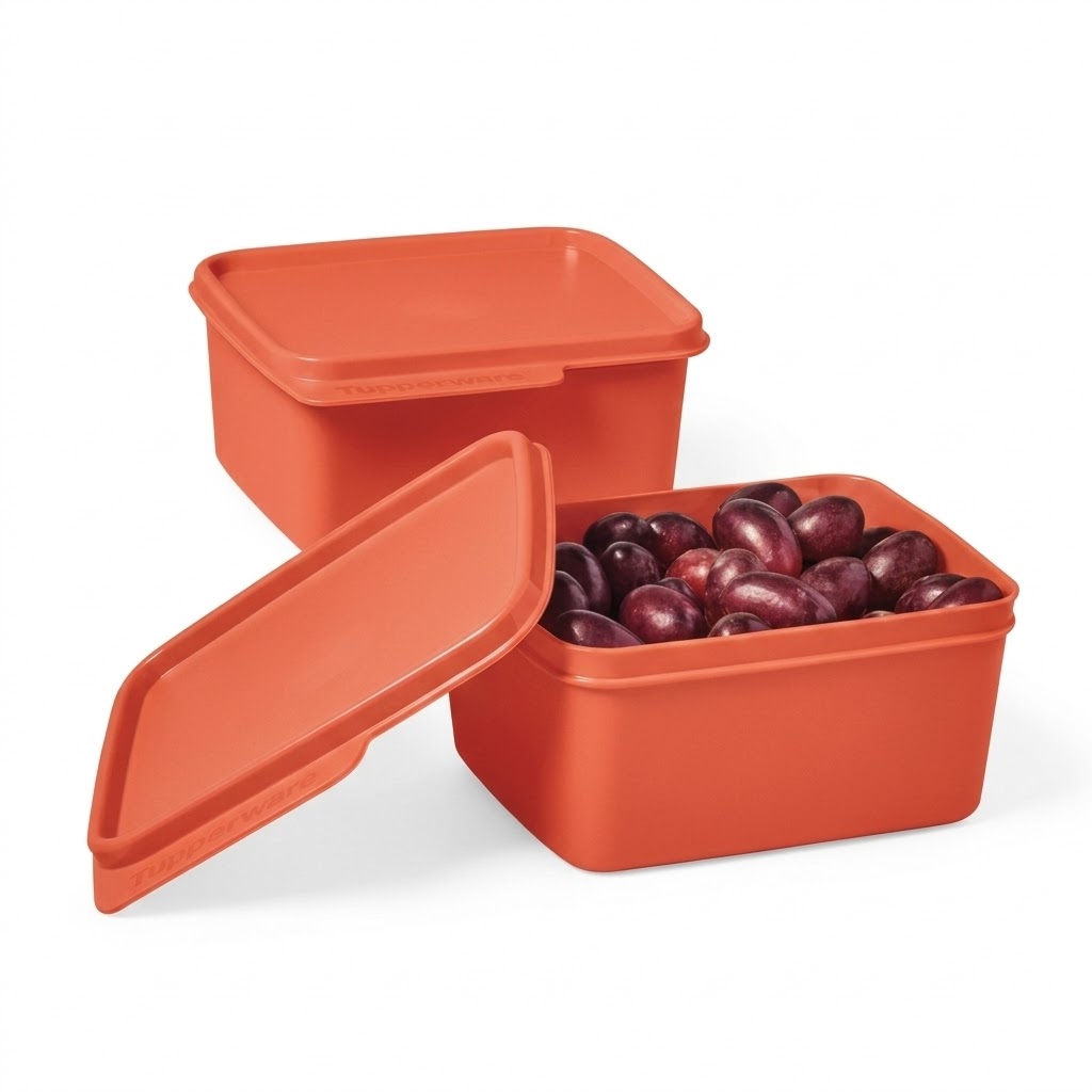 A cor Laranja Coral ilumina a organização, criando aquele visual leve e moderno que transforma até o pré-preparo da semana em algo mais prazeroso. Já o formato quadrado foi pensado para aproveitar melhor cada espacinho da geladeira, encaixando, empilhando e deixando tudo mais prático.